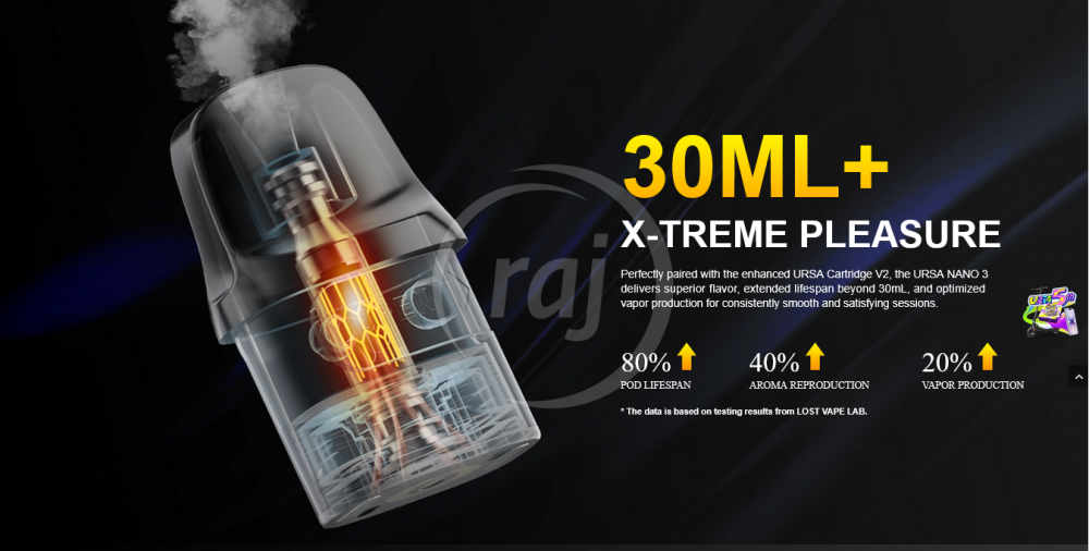 Ponúka maximálny výkon 30 W, batériu s kapacitou 1200 mAh pre až 4 dni používania a kompatibilitu s URSA Cartridge V2.