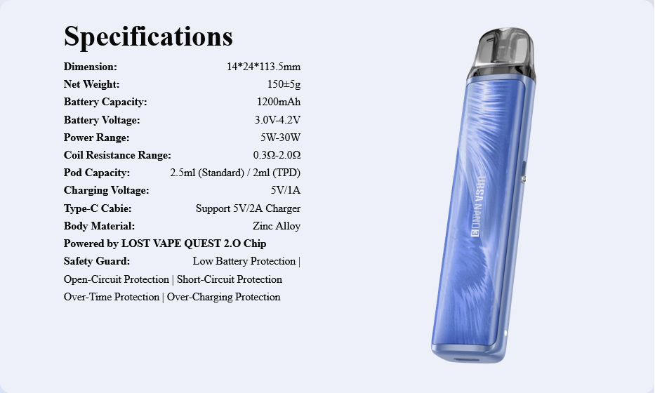 Ponúka maximálny výkon 30 W, batériu s kapacitou 1200 mAh pre až 4 dni používania a kompatibilitu s URSA Cartridge V2.