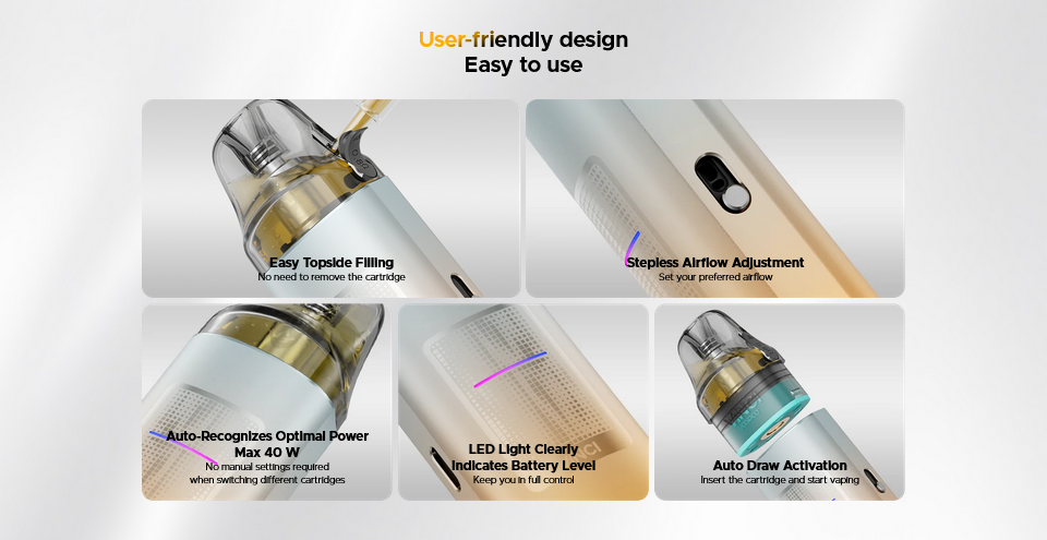 Zásadnú úlohu zohráva aj vylepšená cartridge VINCI S s objemom 2ml a pohodlným plnením z hornej strany, ktorá využíva technológiu iCOSM CODE 2.0. Tá optimalizuje chuť, minimalizuje riziko pretekania a prináša mimoriadne konzistentnú tvorbu pary aj po dlhej dobe používania.