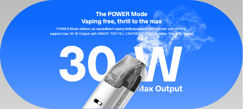 Disponuje vstavanou 1500mAh batériou, maximálnym výkonom 30W a dvoma režimami poťahu - ECO pre úsporný chod s inteligentnou reguláciou výkonu a POWER pre ručné nastavenie a intenzívnu produkciu pary.